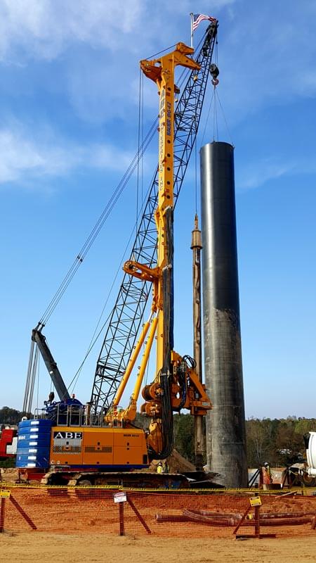 ABE constructed 3 large diameter (120 inch diameter) Vertical Heat Treat pits measuring 85 foot deep each. ABE installed full depth permanent steel liners/casing in each shaft with diameters of 84 –inches to 108 inches weighing up to 70,000 lbs each. The steel liners were concreted in place around the outside and bottom plates were welded at the base of each shaft to provide a sealed water tight condition. The approach to drill the shafts using large diameter tooling was done as a Value Engineering option to replace traditional beam and lagging shoring with internal bracing which would have been more costly and much slower.
